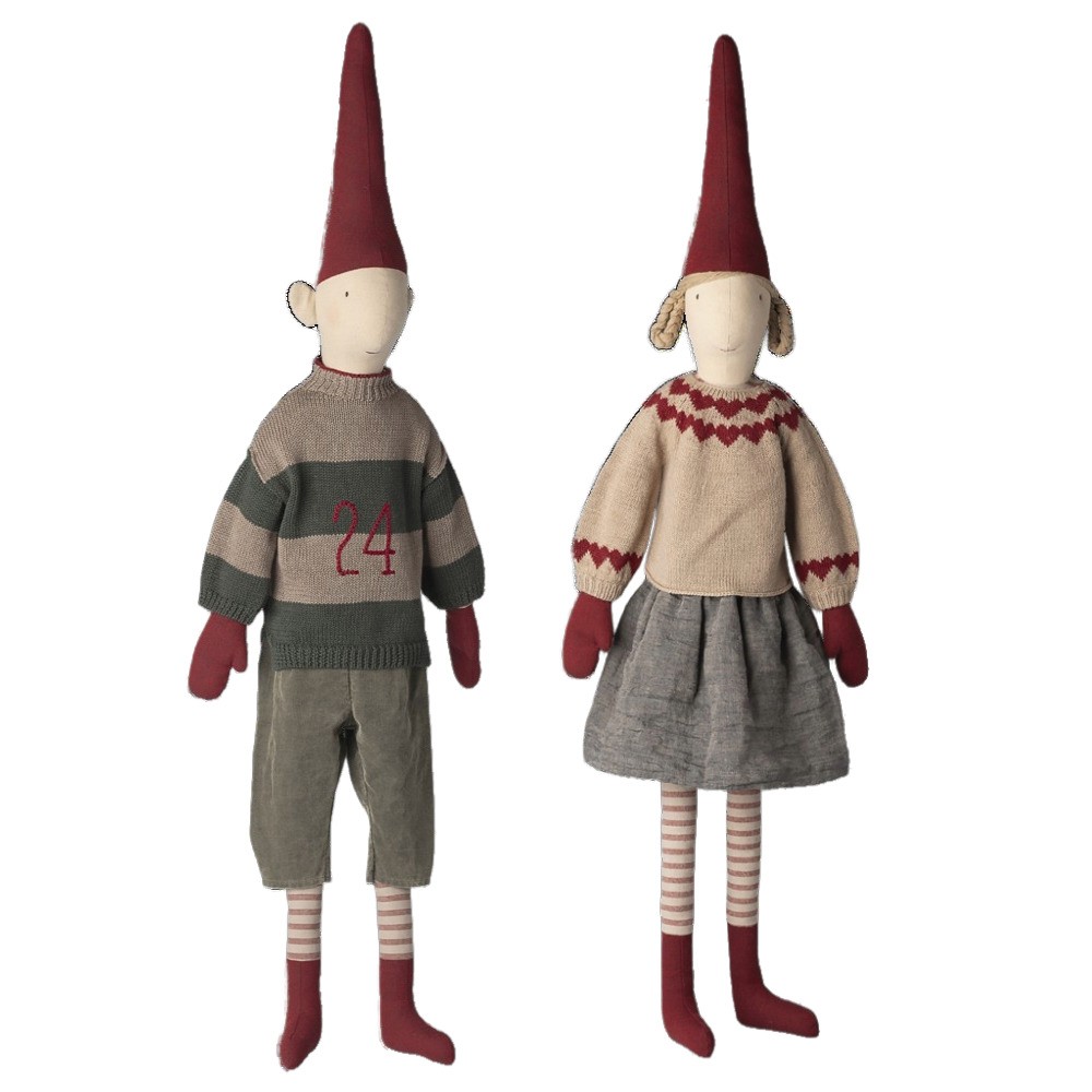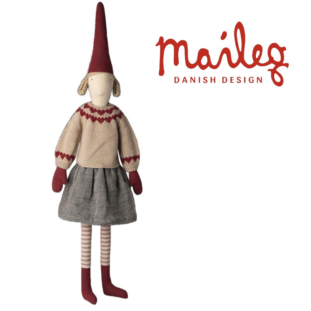 Maileg nissedreng 2025 str 6, med strikket sweater og bukser på